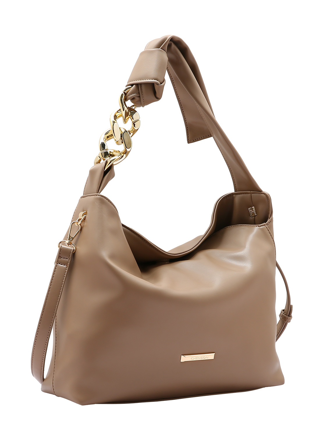 Alça em PU com detalhes acorrentados estilo Hobo ombro, acompanhada de um detalhe em ferragens douradas, adicionando um toque de sofisticação